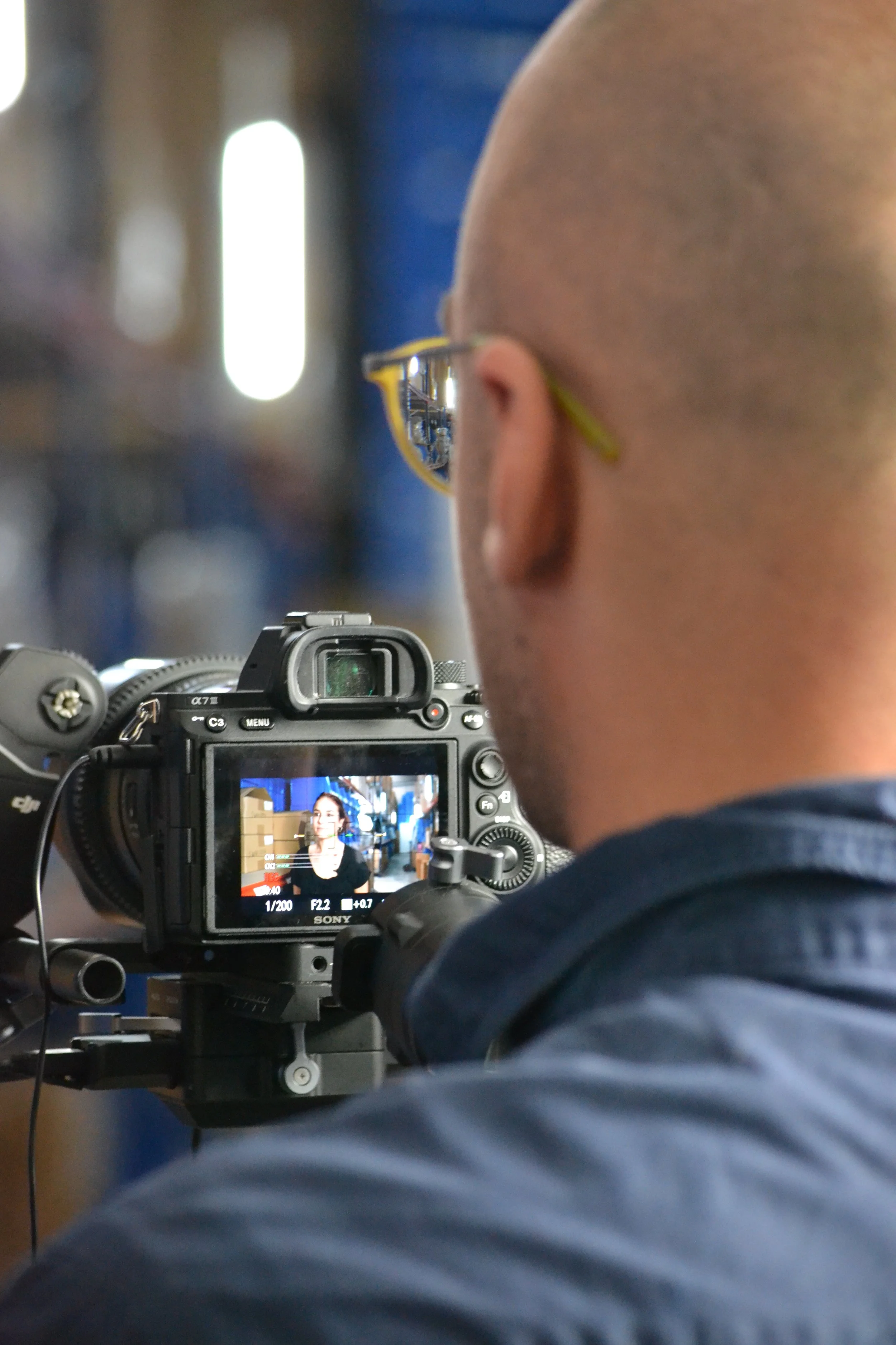 • Person filming with a DSLR camera showing a subject on the screen.