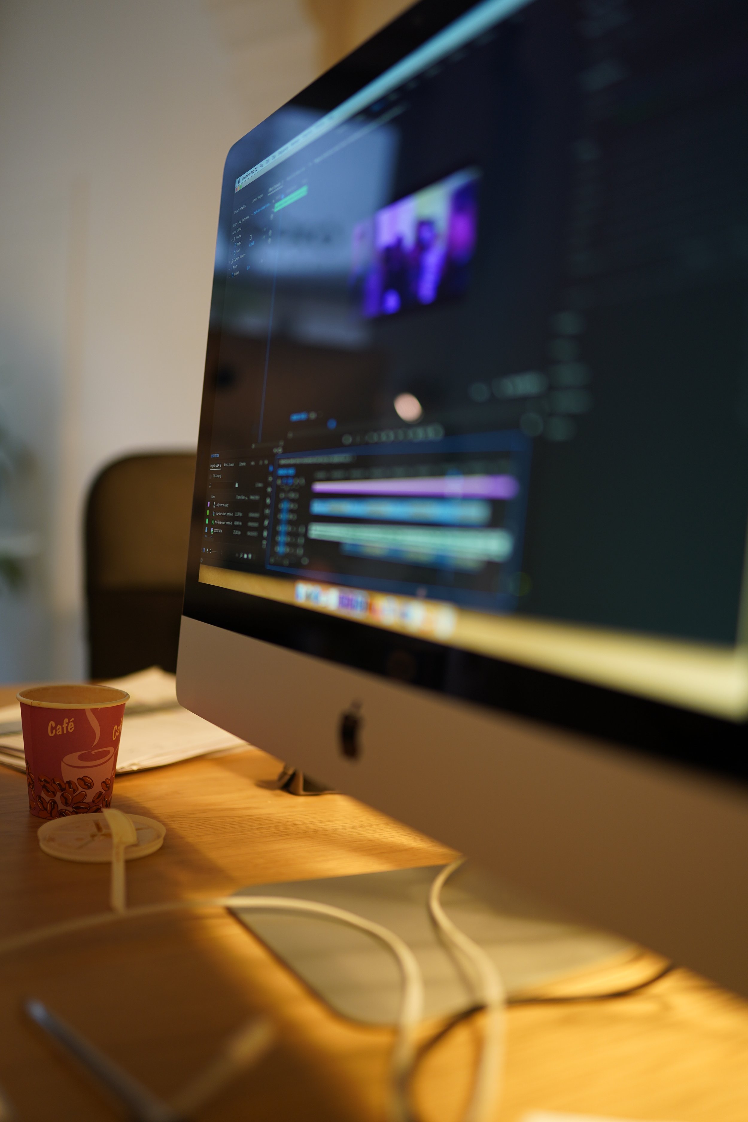 • Desktop computer displaying video editing software, coffee cup on desk